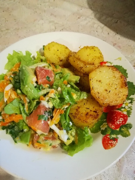 Пп обед.Картофель варёный, затем немного подрумяненый на сливочном масле+специи Салат: варёная морковь, яйца, огурец потерла на тёрке, авокадо, листья салата, сёмга слабосоленая. Без заправки. Приготовила Елена Иванова