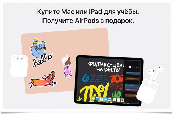 «Снова в школу» – Скидки для учащихся и преподавателей. Покупайте Mac и iPad по специальным ценам для учащихся и сможете получить AirPods в подарок. Также вам будут доступны AirPods Pro со скидкой и аксессуары по выгодным ценам. А ещё для студентов и преподавателей действуют скидки на Apple Music, AppleCare и многое другое.Акция действует до 29 октября и доступна при заказе на специальной странице сайта Apple, а также во многих магазинах премиум реселлеров. Скидки доступны студентам, абитуриентам, их родителям, преподавателям и сотрудникам учебных заведений любого уровня. Подробнее › apple.com/ru-edu/shop/back-to-school