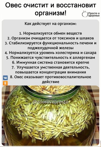 Проверенные временем рецепты! 1. Отвар из овса способствует быстрому избавлению от токсических соединений и шлаков. Приготовление: Двести грамм зерна залить полутора литрами воды, емкость расположить на огне. Вываривать час на маленьком огне. Готовое средство фильтруют и принимают по половинке стакана до пяти раз в двадцать четыре часа. Подобный отвар разрешается употреблять неограниченное время в виду того, что средство не вызывает неприятных ощущений и раздражения слизистых оболочек. 2. Овес для очищения организма в виде настойки обладает не менее прекрасным эффектом. Готовить подобное лекарство в домашних условиях довольно просто, а результат порадует человека. Как готовить: Берут овес и воду в пропорции ?, Оставляют на шестнадцать часов в тепле. Как пить лекарство? Принимать нужно до трех раз в день. Деткам разрешено давать по столовой ложке лекарства. Настойка помогает быстро вывести токсины из организма.